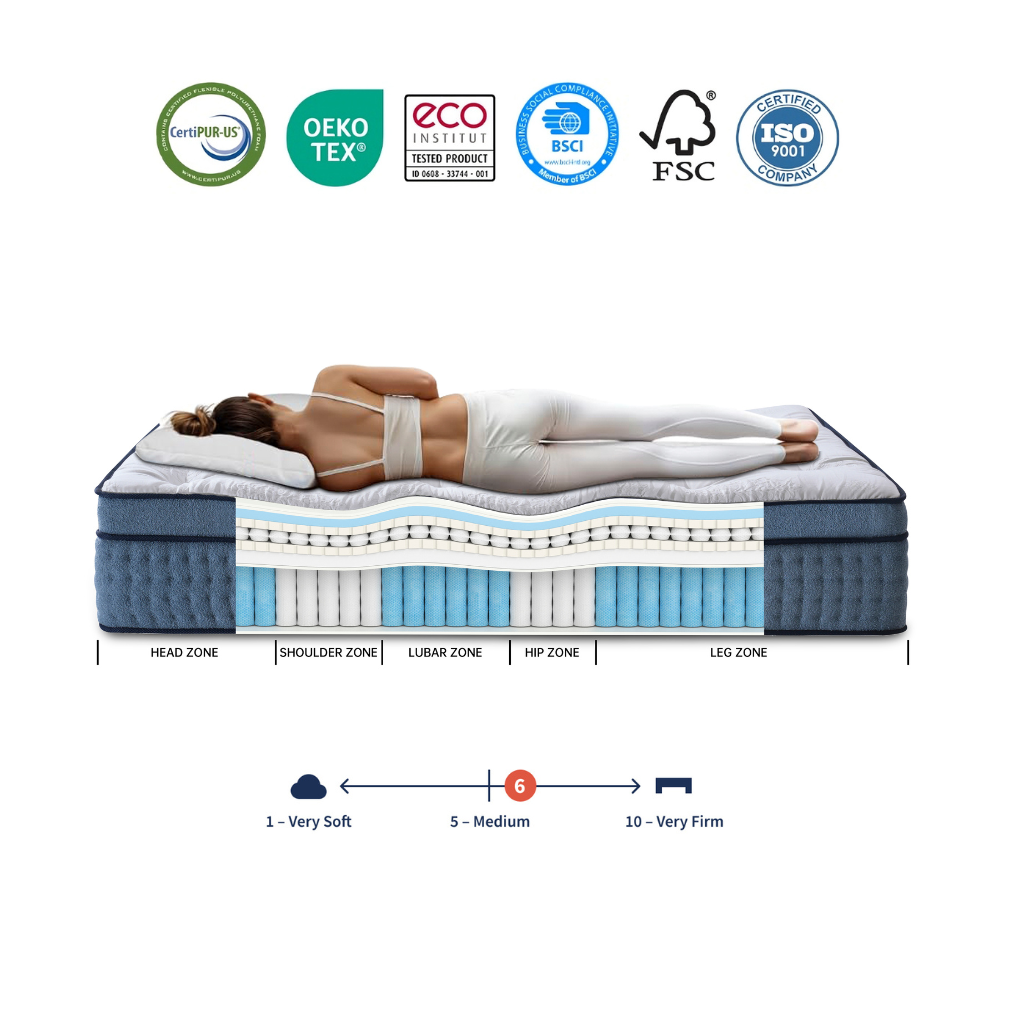 A perfect hybrid of breathable latex / memory foam & supportive pocket spring construction.